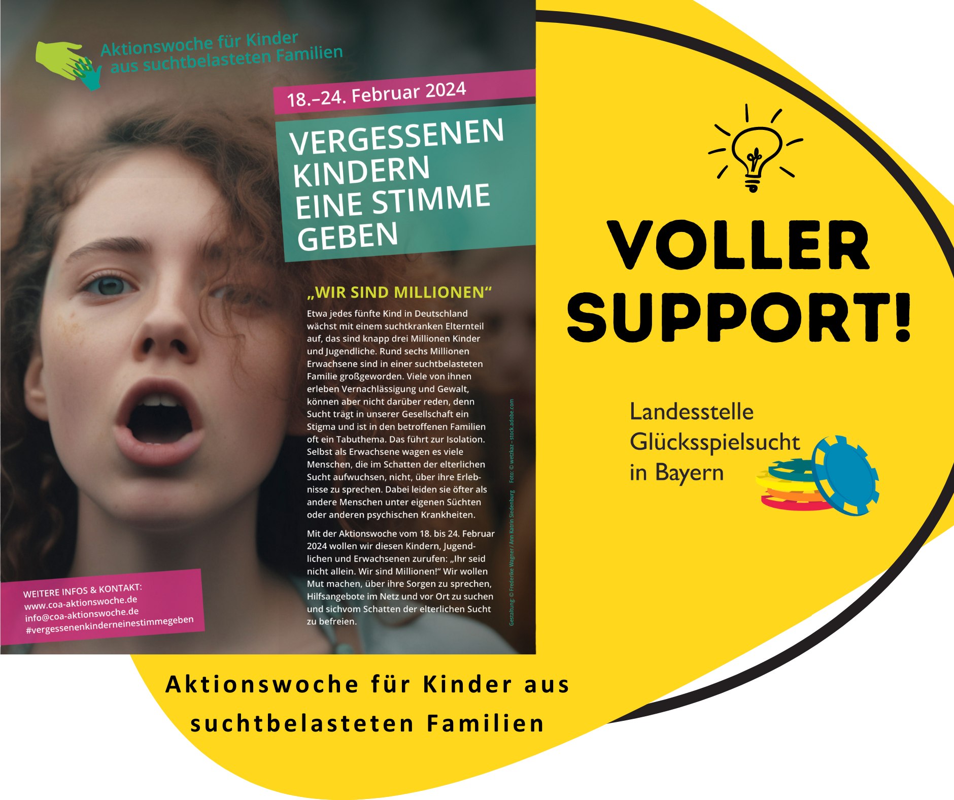 Auch in diesem Jahr unterstützt die Landesstelle Glücksspielsucht in Bayern (LSG) wieder die COA-Aktionswoche für Kinder aus suchtbelasteten Familien unter dem Motto „Vergessenen Kindern eine Stimme geben - Wir sind Millionen“.