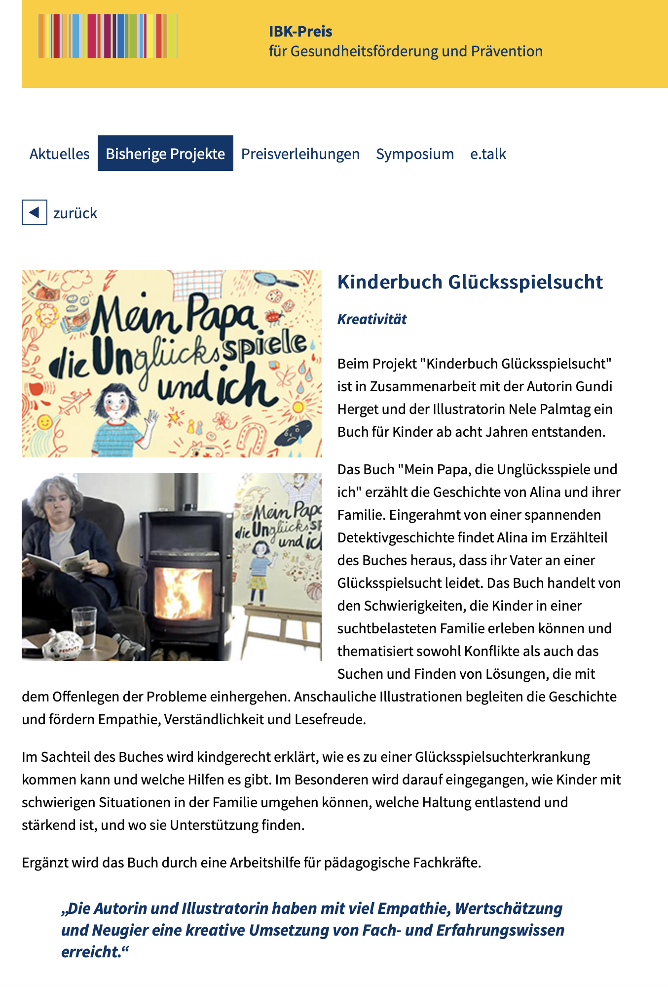 Wir freuen uns sehr: Unser Kinderbuch "Mein Papa, die Unglücksspiele und ich" wurde für den 8. IBK-Preis für Gesundheitsförderung und Prävention nominiert.