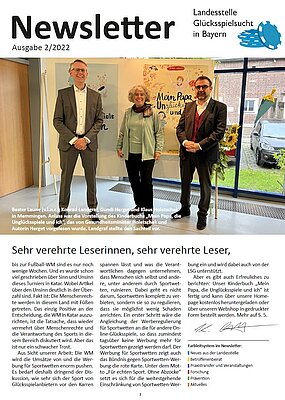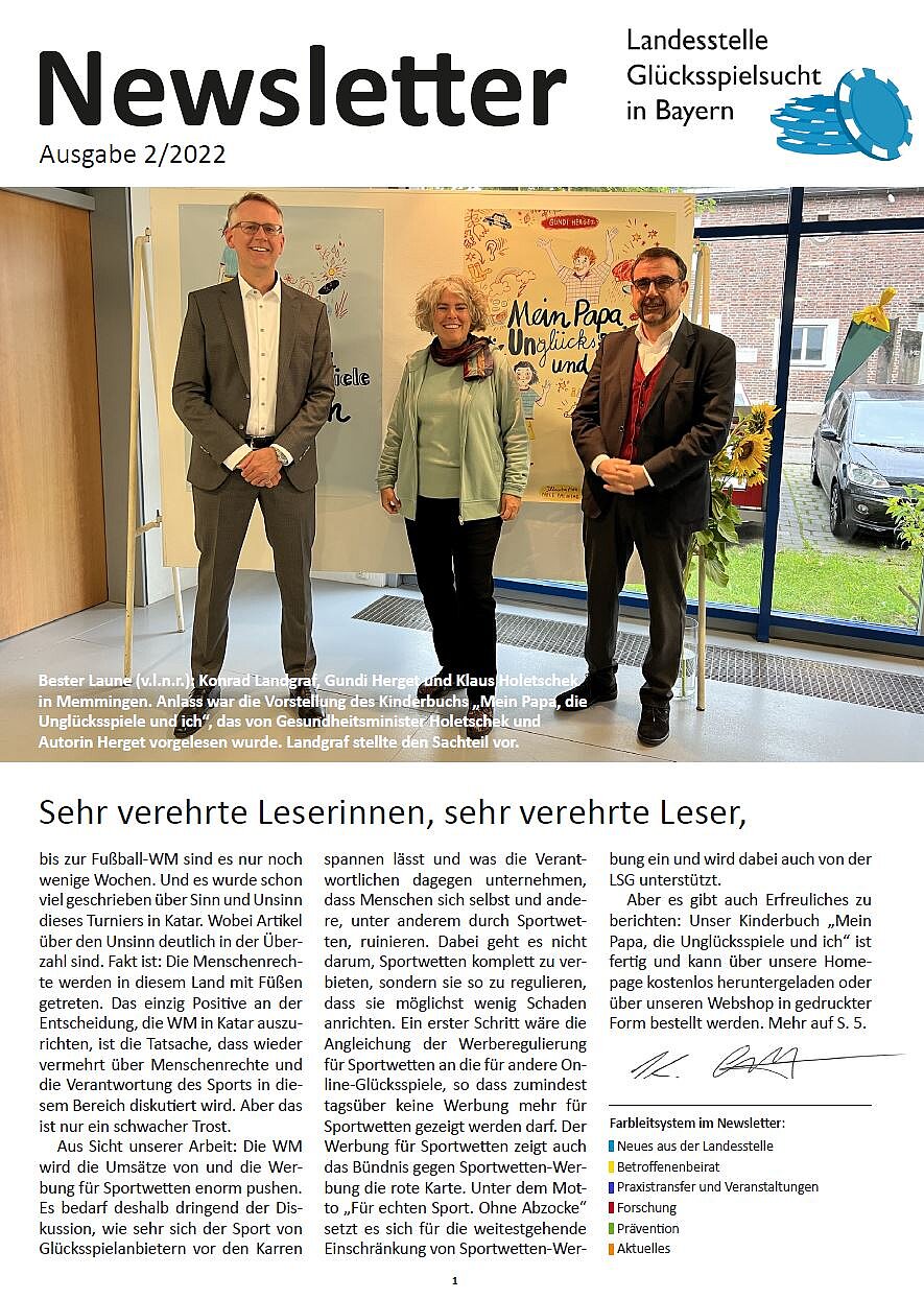 Heute erscheint der zweite Newsletter der Landesstelle Glücksspielsucht in Bayern in diesem Jahr. Wir haben wieder jede Menge interessante Themen für Sie zusammengestellt. Besonders erwähnen möchten wir die Bilderstrecke zum diesjährigen Aktionstag gegen Glücksspielsucht und den Artikel über unser brandneues Kinderbuch "Mein Papa, die Unglücksspiele und ich". Außerdem gibt es wie immer zahlreiche interessante Beiträge aus den Bereichen Prävention, Praxistransfer, Forschung und natürlich von unserem Betroffenenbeirat Bayern Stimme der SpielerInnen.