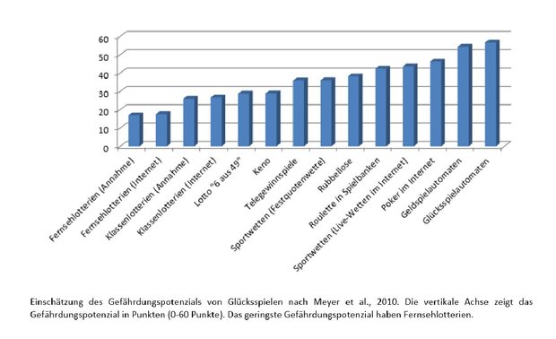 Basierend auf den Merkmalen Ereignisfrequenz, multiple Spiel- und Einsatzgelegenheiten, Gewinnwahrscheinlichkeit, Ton- und Lichteffekte, variable Einsatzhöhe, Verfügbarkeit, Jackpot, Auszahlungsintervall, Beinahe-Gewinne und Kontinuität des Spiels wurde das Gefährdungspotenzial verschiedener Glücksspiele für das Entwickeln glücksspielbezogener Probleme beim Spielen ermittelt (Meyer et al., 2010). Es zeigt sich ein vergleichsweise höheres Risiko für Glücksspielprobleme beim Spielen an Glücksspiel- oder Geldspielautomaten gegenüber Lotterien und Lotto (siehe Abbildung). Zudem zeigt sich besonders für junge Erwachsene ein erhöhtes Suchtpotenzial für Live-Wetten, welche durch ereignisdifferenzierte Wettoptionen, die Zugangsmodalität Internet und erhöhte Werbetätigkeiten verstärkt junge Menschen ansprechen, die generell eine erhöhte Risikoneigung besitzen (Hayer & Kalke 2021). Als besonders gefährlich erweisen sich aufgrund der permanenten Verfügbarkeit und struktureller Charakteristika Online-Glücksspiele (Chóliz, 2015; Meyer et al., 2017).