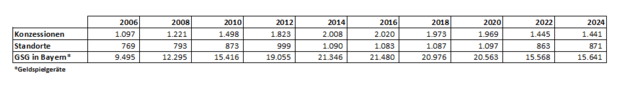 In Bayern beläuft sich die Anzahl der Spielhallenstandorte aktuell auf 871 mit 15.641 Geldspielgeräten (ohne Gastronomie, ohne Kommunen unter 10.000 Einwohner (Stand 2024).